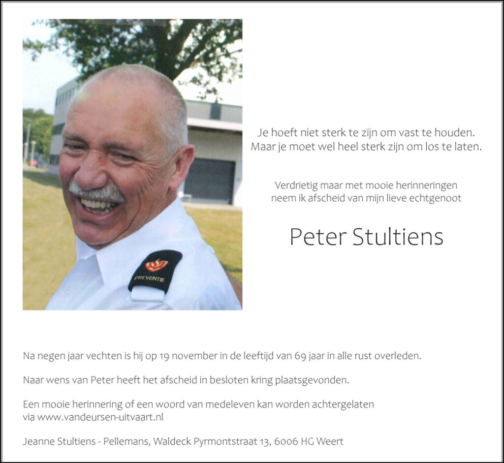 Met grote verslagenheid hebben wij kennisgenomen van het overlijden van Peter,
